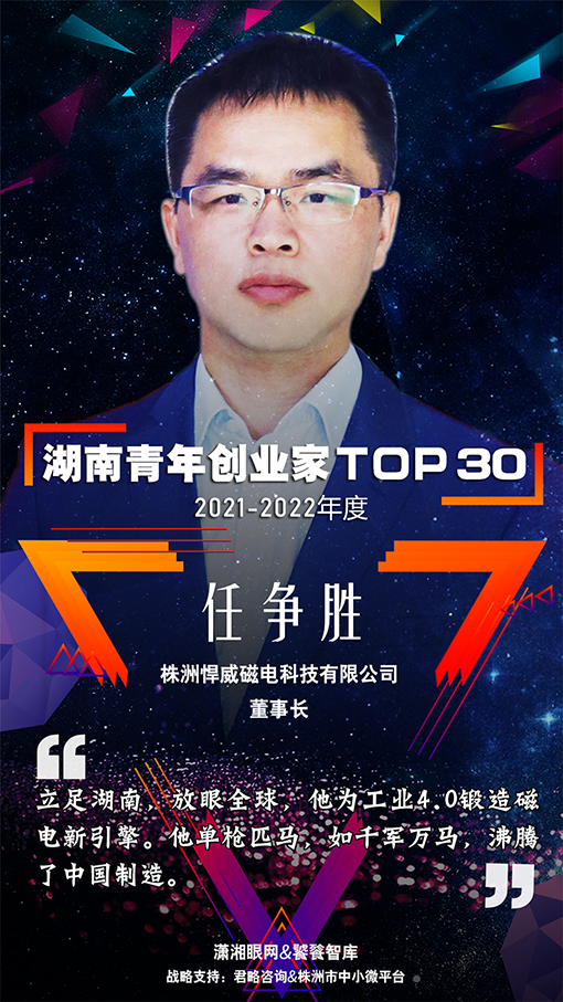 據悉,本次「湖南青年創業家」評選面向45歲及以下湖南籍或最近一年在湖南工作的創業者中開展。自今年3月組委會發起征集令以來,共收到100多份自薦或推薦申請表,專家組綜合候選人的影響力、創新力、社會責任、投資價值等六大指標進行評定,最終推選出了2021-2022年度湖南青年創業家TOP30名單,悍威磁電董事長任爭勝先生便列于名單之上。