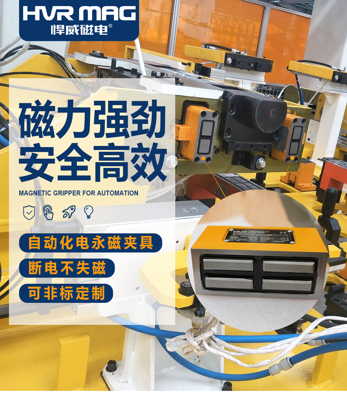 自動化焊接電永磁夾具具有很強的吸附能力,是鋼板焊接過程的非常合適的吸附工具。它們可以吸附在所有導磁金屬表面上,并可以固定不同大小和形狀的鋼板,使焊接過程變得越來越安全。