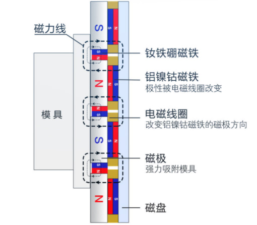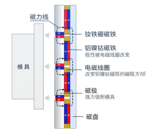 電磁線圈內通過一個瞬間勵磁電流后(0.1-0.5秒),鋁鎳鈷磁鐵的磁極方向改變,釹鐵硼磁鐵和鋁鎳鈷磁鐵的磁極極性相同,磁力線集中于磁極表面,與模具形成磁回路,夾緊模具。