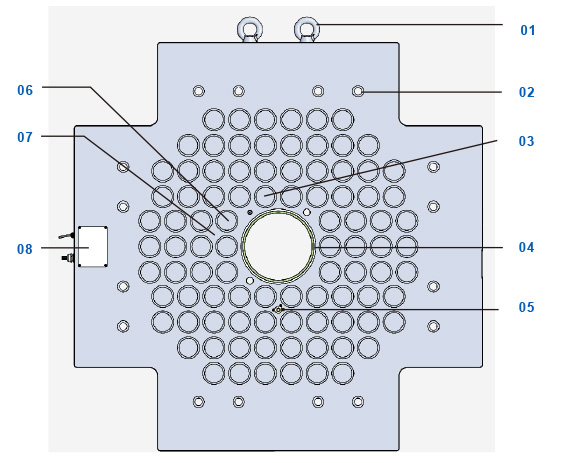 01吊環螺釘 02安裝螺釘孔 03模具錯動檢測 04定位環 05距離檢測 06磁通量檢測 07溫度檢測 08接線盒