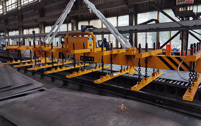 下圖是起重電永磁鐵在一家車輛制造企業的使用場景,專為工廠的精細等離子切割線上下料用,吊運材質為Q235和Q345等普通碳鋼的單張鋼板,鋼板規格為6000mm×1500mm×2-14mm,單張鋼板最重不超過1噸;下料的最小吸附零件尺寸是800mm×800mm。
