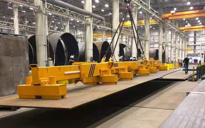 悍威磁電的吊運方案:20噸伸縮梁磁力吊具,結合車間現有的橋式起重設備,聯合搬運厚重板。20噸指的是該鋼板磁力吊具的安全工作負載。