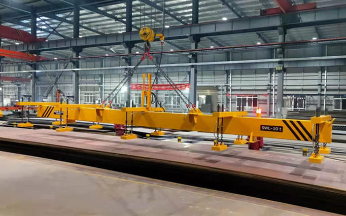 從圖片中可以看到,我們的客戶是河南省的一家鋼結構公司,它利用我們的10噸工業(yè)吊裝磁鐵和橋式起重機,將一塊大的重型鋼板吊到鋼的預處理線上。這種類型的鉤下提升裝置在橫梁上裝有5組磁性模塊,適用于各種尺寸的板,因為磁性模塊可以針對各種尺寸的板進行選擇性激活/停用。指示燈為綠色,表示磁體已成功磁化。