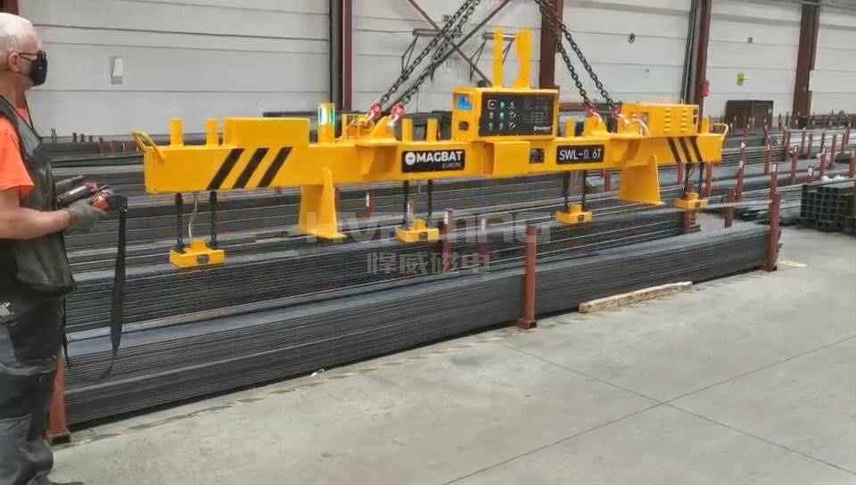 充電式設計,就彌補了鋼鐵廠車間供電不便的短板,實現對板材的搬運。此外,所有悍威磁電的磁力吊具在吊運過程都是不用電的,僅在控制磁力開關的充磁退磁瞬間用電。這也是客戶選擇悍威的原因之一。